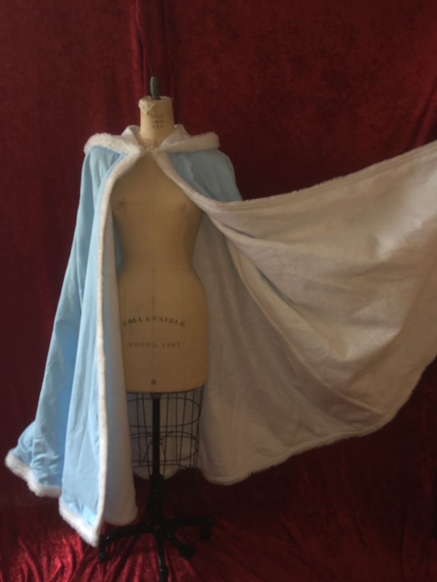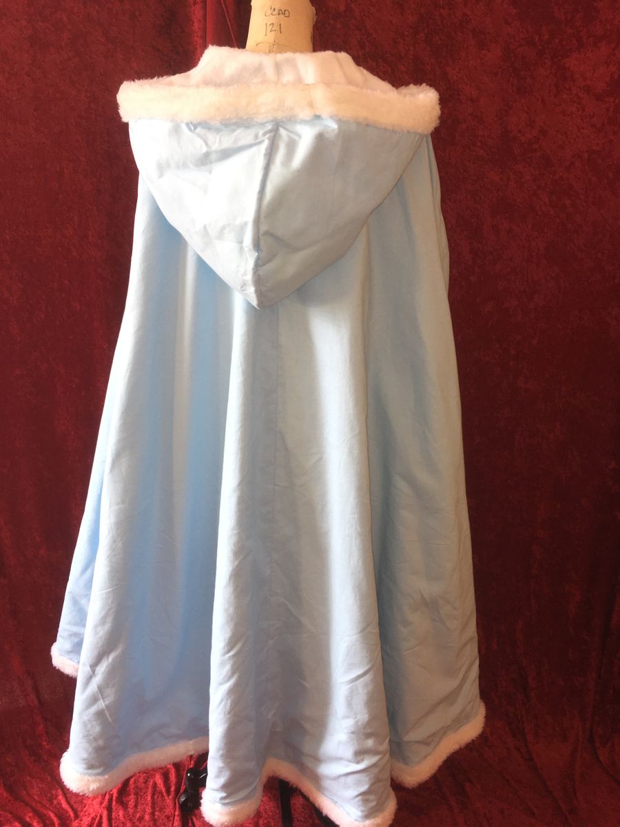 Fully lined sky blue cape with hood. Thicker plush around the front edge and hood. Made by me, and worn once to a cosplay convention.