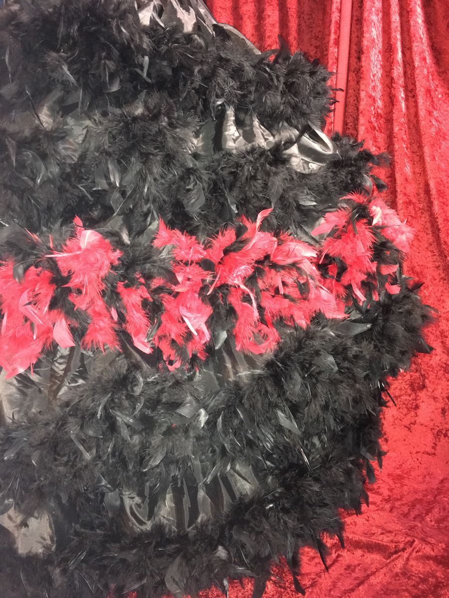 Crinolines come in black or white, and the waist is adjustable with a drawstring and Velcro closure. The feathers come in nearly every color you might need.